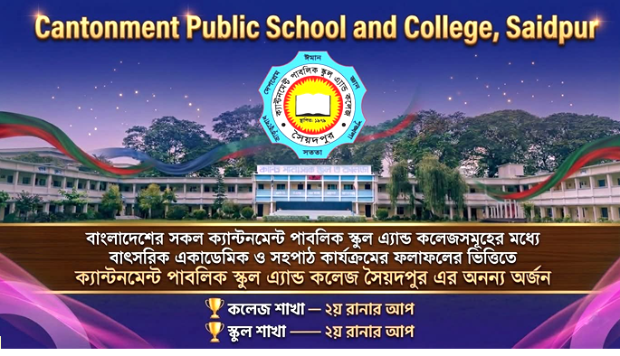 বাংলাদেশের সকল ক্যান্টনমেন্ট পাবলিক স্কুল এ্যান্ড কলেজ সমূহের মধ্যে বাৎসরিক একাডেমিক ও সহপাঠ কার্যক্রমের ফলাফলের ভিত্তিতে (ক্যান্টনমেন্ট পাবলিক স্কুল এ্যান্ড কলেজ সৈয়দপুর এর অনন্য অর্জন স্কুল শাখা – ২য় রানার আপ গৌরব অর্জন করে)